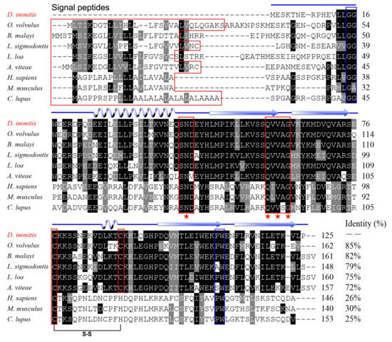 Sequence alignment of Dirofilaria immitis cysteine protease inhibitor (Di-CPI). Alignment of the deduced Di-CPI amino acid sequence with those of homologous proteins from nematodes (Onchocerca volvulus, AAA29423.1; Brugia malayi, AAD51086.1; Litomosoides sigmodontis, AAF35896.1; Loa loa, XP_003147913; Acanthocheilonema viteae, AAA87228.1) and mammals (Mus musculus, NP_034106.2; Human, AAH13083.1; Canine, XP_003639869.1) was performed using Clustal X software version 2 and shaded using BOXshade version 3.21. Predicted secondary structural elements, including