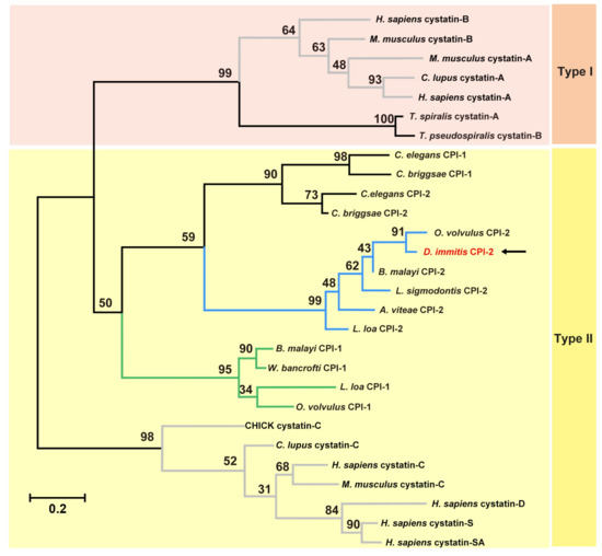 Phylogenetic relationships between Di-CPI and homologous cystatins/CPIs. The tree was constructed from a multiple sequence alignment performed using Clustal W2 and plotted using MEGA 6.06. Amino acid sequences used in the tree, with their GenBank accession numbers, are as follows: Homo sapiens cystatin-B, NP_000091.1; Mus musculus cystatin-B, NP_001076014.1; Mus musculus cystatin-A, NP_005204.1; Canis lupus familiaris cystatin-A, SPO16019.1; Homo sapiens cystatin-A, NP_005204.1; Trichinella spiralis, KRY35881.1; Trichinella pseudospira, KRZ14801.1; Caenorhabditis elegans CPI-1, NP_500915.1; Caenorhabditis briggsae CPI-1, CAP25989.2; Caenorhabditis elegans CPI-2, AF068718.1; Caenorhabditis briggsae CPI-2, CAP29292.1; Onchocerca volvulus CPI-2, |P22085.2; Brugia malayi, AAD51086.1; Litomosoides sigmodontis, AAF35896.1; Acanthocheilonema viteae, AAA87228.1; Loa loa CPI-2, XP_003147913.1; Loa loa CPI-1, XP_003136654.1; Brugia malayi CPI-2, U80972.1; Wuchereria bancrofti, EJW82673.1; Onchocerca volvulus CPI-1, AF177194.1; CHICK, P01038.2; Canis lupus familiaris cystatin-C, XP_003639869.1; Homo sapiens cystatin-C, P01034.1; Homo sapiens cystatin-D, P28325.1; Homo sapiens cystatin-S, P01036.3; Homo sapiens cystatin- SA, P09228.1. Numbers indicate bootstrap values. The branches in grey and in black represent mammalian cystatins and nematode cystatins, respectively. In addition, the green and blue branches represent first subgroup of filarial cystatins and the second subgroup of filarial cystatins, respectively. The pink and yellow backgrounds represent type I and type II cystatins, respectively.