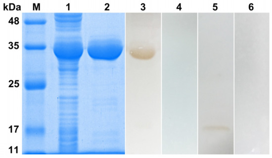 Sodium dodecyl sulphate–polyacrylamide gel electrophoresis (SDS-PAGE) and Western blotting analysis of Di-CPI. M, molecular weight markers; Lane 1, IPTG-induced recombinant (r) Di-CPI in Escherichia coli BL21 (DE3); Lane 2, purified rDi-CPI (6 μg); Lane 3, purified rDi-CPI probed with serum from a dog naturally infected with D. immitis (6 μg); Lane 4, purified rDi-CPI probed with naive dog serum; Lane 5, total protein from D. immitis probed with anti-rDi-CPI serum (20 μg); Lane 6, total protein from D. immitis probed with native (preimmune) rabbit serum (20 μg).