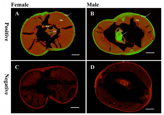 Immunolocalization of native Di-CPI. Both adult female and male worms were probed. The location of native Di-CPI protein is indicated by green fluorescence. Sections (5 μm) were incubated with either rabbit anti-rDi-CPI IgG at 1:100 (A and B) or preimmune IgG at 1:100 (C and D), diluted in phosphate-buffered saline (PBS). Arrows indicate a positive signal in the cuticle of female worms (A) and male worms (B) and the gut of male worms (B). No staining was observed for female or male worms using IgG purified from preimmune serum (C and D), confirming specific immunolabeling was achieved. Cu, cuticle; Gu, gut; Ov, ovary. Scale bars = 100 μm.