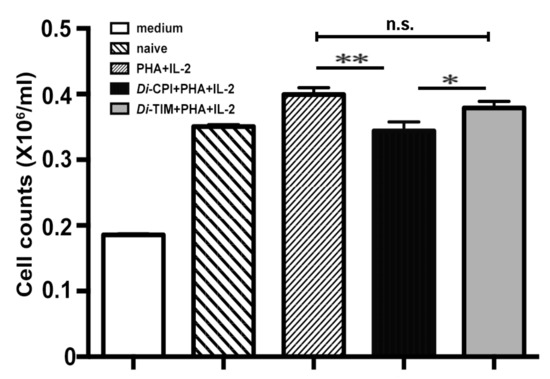 Inhibition on the proliferation of canine peripheral blood mononuclear cells (PBMCs) by Di-CPI. Canine T cells were stimulated with PHA + IL-2, PHA + IL-2 + rDi-CPI, or PHA + IL-2 + rDi-TIM for 48 h as determined by CCK-8. Di-CPI inhibited the proliferation of canine T cells by 15% compared with naive controls and 10% compared with Di-TIM controls. Naive indicates no protein was added to wells. Data are mean ± SEM of 3 samples with triplicate wells; representative data from one of three independent experiments. Statistically significant differences (* p < 0.05, ** p < 0.01) were determined by Student’s t-tests.