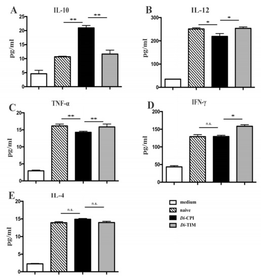 Analysis of cytokines following inhibition of canine PBMCs by Di-CPI. Supernatants of canine PBMCs stimulated for 48 h were subjected to ELISA to measure the concentration of IL-10, IL-12, TNF-α, IFN-γ, and IL-4. rDi-CPI treatment increased anti-inflammatory cytokine IL-10 (A), followed by significant decrease of the production of IL-12 (B) and TNF-α (C). IFN-γ (D) and IL-4 (E) showed no significant difference compared with controls. Naive indicates no protein was added to wells. Data are mean ± SEM of 3 samples with triplicate wells; representative data from one of three independent experiments. n.s., not significant. Statistically significant differences (* p < 0.05, ** p < 0.01) were determined by Mann–Whitney U-tests.