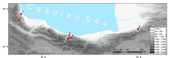 Map with sampling localities. 1–Gilan Province, Talysh-mountains, 12 km S Assalem, 700 m a.s.l.; 2–Mazandaran Prov., SE of Chalous city, Lashkenar village, valley of Zereshkdarreh; 3–Yeilagh-e-Sarasi, ca. 45 km SE Khalkhal, Delmadeh (Daylamdeh) village; 4–Mazandaran Province, near Veysar village; 5–Iran, Mazandaran Province, Veysar village, Noshahr City, Zaresk-Dareh; 6–Shirabad Cave, 5 km SE (by air) of Shirabad, 60 km E (by air) of Gorgan. Locality-IDs as in Table S1.