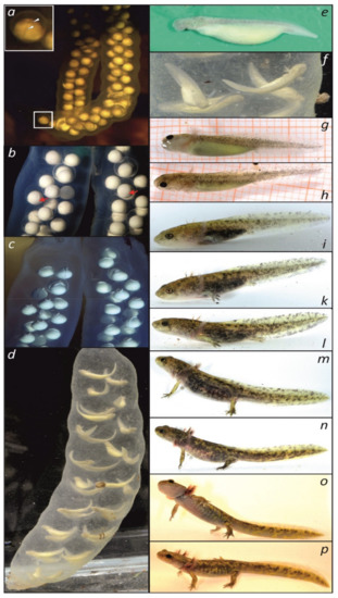- Ebrahimi, M.; Kami, H.G.; Stöck, M. First description of egg sacs and early larval development in Hynobiid Salamanders (Urodela, Hynobiidae, Batrachuperus) from north-eastern Iran. Asian Herpetol. Res. 2004, 10, 168–175. [Google Scholar]