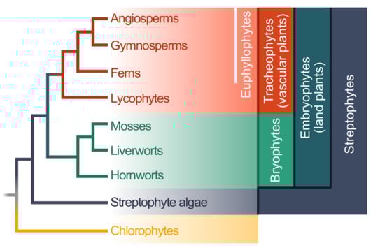 Land plants (embryophytes) are a monophyletic group that is estimated to be 474 to 515 million years old []. The entire clade is deeply split into the bryophytes and tracheophytes (Figure 1); whether the bryophytes are monophyletic is still debated, but the assertion of monophyly receives more and more support [,,]. The bryophytes encompass the mosses, liverworts, and hornworts (Figure 1). The tracheophytes encompass the lycophytes and euphyllophytes; the latter can be broken up into ferns and seed plants. Within the seed plants are the gymnosperms (e.g., conifers) and angiosperms (Figure 1).