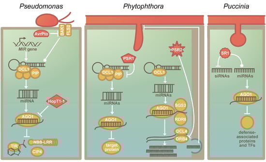 The suppression of the RNA silencing machinery of plants by pathogen-encoded RNA Silencing Suppressors: (a) The known effectors that affect host RNA silencing in P. syringae. AvrPto inhibits the association of BRASSINOSTEROID INSENSITIVE 1-associated receptor kinase 1 (BAK1) and FLAGELLIN-SENSITIVE 2 (FLS2), which results in the stabilization of pre-miRNAs and reduces miRNA abundance []. HopT1-1 interferes directly with the RNA silencing machinery by inhibiting the function of AGO1 []. Nucleotide-binding site-leucine-rich repeats (NBS-LRRs), TRANSPORT INHIBITOR RESPONSE 1 (TIR1) and COP1-interacting protein 4 (CIP4) are known targets of miRNAs that are affected by RNA silencing suppressors of P. syringae. (b) The known RNA silencing suppressors of Phytophthora sp. PSR1, a P. sojae-specific RNA silencing suppressor, interacts with PIP1. PIP1 is required for the correct assembly of the Dicing-bodies, which are the protein complexes that include DCL1. The destabilization of the Dicing-body results in reduced miRNA accumulation. PSR2 is conserved in several Phytophthora species. [,]. It binds and inhibits DRB4. DRB4 acts in the phasiRNA pathway, and PSR2 specifically reduces phasiRNAs that are secreted—likely via extracellular vesicles. These phasiRNAs have a target in Phytophthora and targeting impacts the virulence and sporulation of the pathogen []. (c) The function of the recently identified RNA silencing suppressor of Puccinia graminis f. sp. tritici (Pgt). PgtSR1 (SR1) negatively regulates siRNA biosynthesis and affects miRNA biogenesis. The miRNAs that were affected had targets that are associated with plant defense signalling, including several defense-associated transcription factors [].