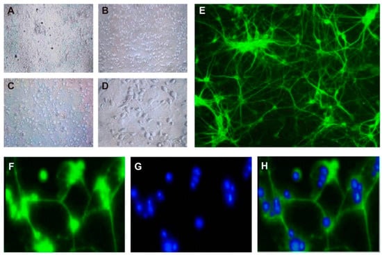 Culture and identification of hippocampal neurons (×200). Morphology of hippocampal neurons (A) immediately after inoculation, (B) 1 day, (C) 2 days, and (D) 7 days. (E,F) Immunofluorescence labeling of hippocampal neurons treated with mouse anti-rat β-III tubulin monoclonal antibody and fluorescein isothiocyanate (FITC)-labeled goat anti-mouse IgG secondary antibody. (G) Neuronal nuclei labeled by Hoechst 33258 labeling. (H) Merged picture of Figure (E,F).