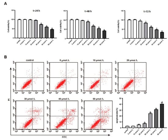 After being induced for 24 h, hippocampal neurons treated with 30–50 μmol/L Aβ1–42 had much lower viability than the negative controls (p < 0.05). At 48 h, hippocampal neuron viability was obviously inhibited when the concentration of Aβ1–42 exceeded 20 μmol/L (p < 0.05); at 72 h, hippocampal neuron viability was all significantly suppressed after they were treated with 10–50 μmol/L Aβ1–42 (p < 0.05). It should also be noted that Aβ1–42 inhibited the viability of hippocampal neurons in a dose-dependent manner (Figure 2A). In addition, Aβ1–42 was able to promote apoptosis of hippocampal neurons in a dose-dependent manner. When hippocampal neurons were treated with 20–50 μmol/L Aβ1–42, their apoptosis rates were all dramatically higher than the negative controls (p < 0.05) (Figure 2B). An amount of 30 μmol/L Aβ1–42 could inhibit hippocampal neuron viability and promote its apoptosis after being induced for 24 h. Therefore, the dose was used in subsequent studies.