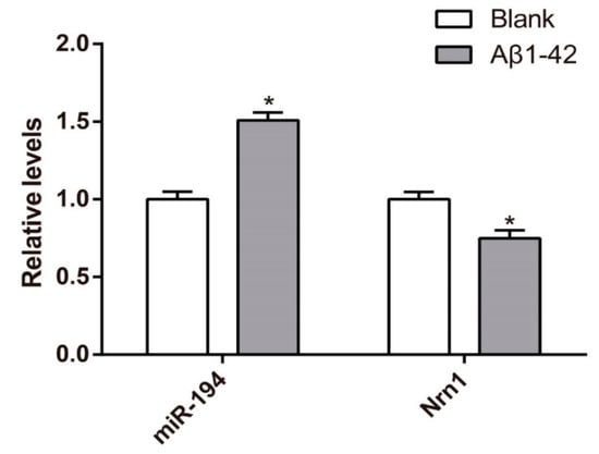 After being induced by 30 μmol/L Aβ1–42 for 48 h, the relative levels of miR-194 in Aβ1–42-transduced hippocampal neurons of the Aβ1–42 group was much higher than that of the blank group (p < 0.05). The scrambled peptide was used for the blank group. In contrast, Nrn1 mRNA was markedly increased in Aβ1–42-transduced hippocampal neurons of the Aβ1–42 group when compared with that of the blank group (p < 0.05) (Figure 3).