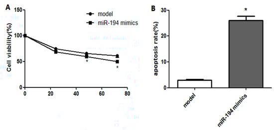 Upregulated miR-194 decreased viability of Aβ1–42-transduced hippocampal neurons (A) and increased the apoptosis of Aβ1–42-transduced hippocampal neurons (B). * p < 0.05 when compared with the model group.