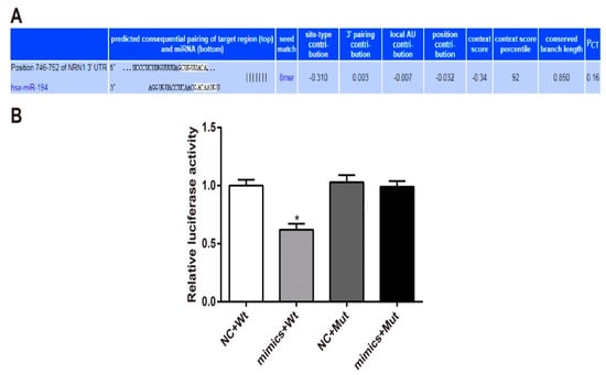 Nrn1 is the target gene of miR-194. (A) Target Scan predicted the binding sites of Nrn1 and miR-194. (B) Luciferase reporter gene assay was used to verify the targeting relationship between miR-194 and Nrn1. * p < 0.05 when compared with the negative control (NC) + wild-type (Wt) group.