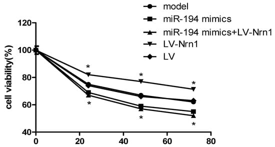 Nrn1 repaired the damage of miR-194 on Aβ1–42-transduced hippocampal neuron activity. * p < 0.05 when compared with the model group at the same time.