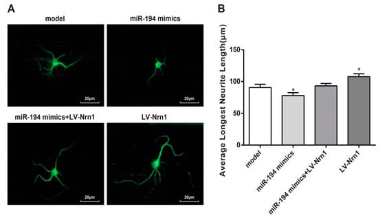 Nrn1 reversed the inhibitory effect of miR-194 on neurite growth of Aβ1–42-transduced hippocampal neurons. (A) Neurite of Aβ1–42-transduced hippocampal neurons were observed under a microscope after they were immunofluorescently stained. (B) Statistical data of the average longest neurite length. * p < 0.05 when compared with the model group at the same time.