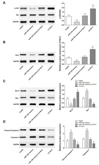 miR-194 regulated apoptosis-related protein expression in Aβ1–42-transduced hippocampal neurons by targeting inhibition of Nrn1 expression and decreasing PI3K/AkT signaling pathway activity. Western blot analysis of the expression of (A) AkT and p-AkT, (B) Nrn1, (C) Bcl-2 and Bax, and (D) Caspase-3 and Cleaved Caspase-3. * p < 0.05 when compared with the model group.