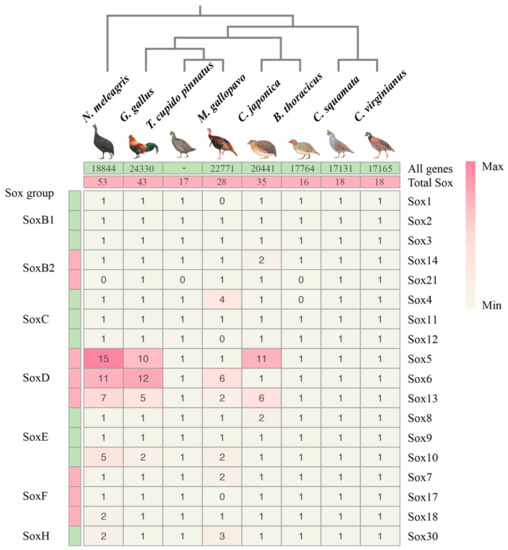 Over the last decade, along with the rapid development of sequencing technologies, the genomic and genetic resources for birds are expanding massively [17,18,19,20,21,22,23]. Now, 12 genome sequences from galliform birds are available from the NCBI database, and eight of which were used in this study, including bamboo partridge [24], chicken [25,26], turkey [27], greater prairie chicken (unpublished), helmeted guineafowl (unpublished), Japanese quail [28], northern bobwhite [29], and scaled quail [30]. Genomic information would be instrumental in helping to understand the Sox gene family in birds. In comparison to mammals, birds have a different sex-determining system (ZZ for males and ZW for females) [31]. This provides a good opportunity to analyze the Sox gene family from a new perspective. Some members of the Sox gene family have been found in birds from the earlier reports. For example, Sox9 cDNAs were isolated from duck and quail (five days and seven days in the gonads) [32]. In several neural crest-derived cell types, the expression of Sox9, Sox10, and Sox5 could activate that of Col2a1 [33]. Sox9 in chicken was observed in seven-day testes with high level expression, while Sox3, Sox4, Sox8, and Sox11 had similar expression levels in both gonads [12]. However, genome-wide investigations of the whole Sox gene family in birds are still largely unknown.