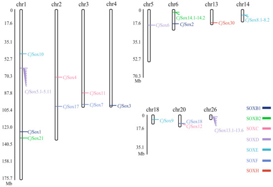 Furthermore, we determined the genomic positions of Sox genes in Japanese quail. These results indicated that the members of the CjSox gene family were randomly distributed across 11 of the 39 quail chromosomes (Figure 2). For example, there is only one Sox member located in chromosomes (chrs) 4, 5, 13, 14, 18, and 26, two Sox members located in chrs 2, 3, 6, and 20, and four Sox members (CjSox1, 5, 10, and 21) located in chr1 (Figure 2). In contrast, no Sox members are present in the remaining chromosomes. This might be considered the result of interchromosome segmental duplication [11].