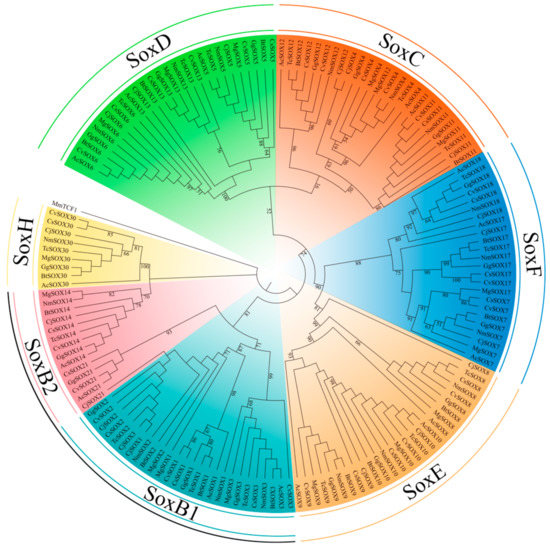 The Sox gene family is defined as a sex-determining region Y (SRY)-related high-mobility group (HMG) box of genes [1]. According to the similarity of HMG domain sequences and structural characteristics, the Sox subfamily is clustered into at least 11 groups (SoxA–K) [2]. The amino acid identity of the same Sox group is usually at least 70% [3]. Groups B–F are found in all vertebrate as core groups [4]. The SoxB gene is the one that duplicated the most recently into SoxB1 and SoxB2, and Sox15 (SoxG) descended from Sox19 (SoxB1) during vertebrate evolution [5]. Interestingly, these core groups probably underwent two duplication and divergence events, often resulting in three closely related Sox genes [3,6]. Non-core groups are lineage-specific, including SoxA in mammals [7], SoxI and SoxJ in Caenorhabditis elegans [1], and SoxK in medaka [8]. Notably, SoxH genes, although previously described as mammalian-specific, have been identified in invertebrates [4]. These non-core groups were considered to have originated from core Sox genes by tandem duplication events and gene losses, e.g., the SRY gene (group A) from Sox3 (group B1), and Sox30 (SoxH) from SoxD [4,5]. Furthermore, subfunctionalization and neofunctionalization are the main reasons for keeping duplicated genes under the selective pressure of evolution [3]. The presence of Sox genes in distantly related species indicates a strong selective pressure on their functional activity.