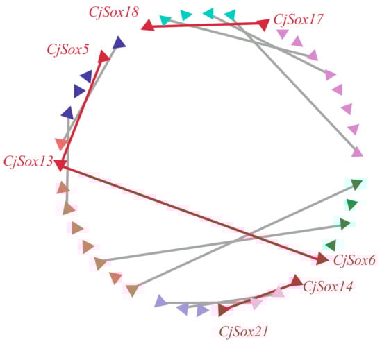 Normally, gene duplication is considered a contributor and an important source of biological evolution [50,72]. Two regions were generally considered to have evolved from duplication events when two or more protein-coding gene pairs flanking the anchor point had the best non-self hit (e-value < 1 × 10−5) [73,74]. To further understand how the Sox gene family evolved, we investigated gene duplication events of the Sox genes in C. japonica. The results of the analysis showed that 11 Sox genes were not present in any microsynteny, such as CjSox1, CjSox2, and CjSox3. This implied that these genes might be derived from duplication events. Additionally, we found significant microsynteny in the quail Sox gene regions. As shown in Figure 5, three conserved genes flanking in the CjSox17/CjSox18 pair, and two conserved genes flanking in the CjSox5/CjSox13, CjSox6/CjSox13, and CjSox14/CjSox21 pairs were identified, respectively. Our findings clearly indicate that four gene pairs were involved in the large-scale duplication during evolution of the Sox family in C. japonica (Figure 5), which is consistent with the published article by Voldoire et al. (2017) in teleost fish [75].