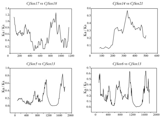 Ka/Ks < 1 suggests a functional constraint; a Ka/Ks ratio greater than one indicates a positive selection; a Ka/Ks ratio of one is neutral [76]. In the present study, we found that the Ka/Ks ratios of all the CjSox gene pairs were less than 0.6 (Table S3), suggesting that these gene pairs have evolved under strong purifying selection.