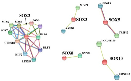 Predicted protein–protein interaction (PPI) network analyses of SOX proteins.