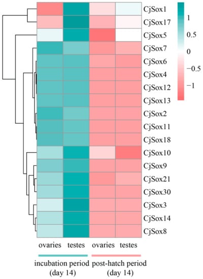 As reported in previous studies, multiple Sox genes were strongly expressed in the gonads and the central nervous system of mice [88,89,90,91], and widely expressed in different stages of embryogenesis [92]. However, so far, Sox genes expression in the gonads development of Japanese quail remains understudied. Thus, we further extracted the expression profiles (unpublished data from our group) for 18 CjSox genes between two developmental stages (incubation and post-hatch periods at 14 days, respectively) from quails with three biological replicates (Figure 8). Genome-wide gene expression analysis can potentially reveal period-specific expression manners for the Sox gene family in quail. SRY is associated with the development of testis, and the inhibition of SRY expression causes defects in testis development [93]. SRY is also directly targeted by Sox9 [94], and previous studies have suggested that Sox9 plays a key role in male gonad development in many vertebrates [95]. Sox9 is down-regulated in the differentiating gonad just before ovary formation in chicken [96]. Notably, our result showed that one gene (CjSox9) was significantly more highly expressed in the incubation period (day 14) than in the post-hatch period (day 14) from both gonads (Figure 8, Figure 9 and Figure S1), implying that Sox9 played a conserved role in the gonadal development of quails. Similarly, during the incubation period (day 14), three genes (Sox5, Sox8, and Sox9) were significantly more highly expressed in testes than in ovaries (q-value < 0.05). Furthermore, this investigation of the post-hatch periods in both gonads revealed that seven genes (CjSox1, CjSox5, CjSox6, CjSox7, CjSox10, CjSox17, and CjSox21) were weakly expressed, whereas the remaining 11 genes were negligibly expressed (Figure S1). We observed that most Sox genes exhibited highly embryo-specific expression in both gonads (Figure 8).