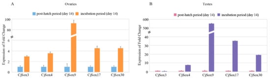 To further confirm the expression profiles, we carried out the qPCR experiment for five randomly selected Sox genes, including Sox3, Sox4, Sox9, Sox17, and Sox30 (Figure 9). Our data suggested that these five CjSox genes presented similar expression patterns as RNA-Seq data. For example, four CjSox genes existed in both gonads, with similarly low expression levels for Sox4, Sox9, Sox17, and Sox30 in the post-hatch period (day 14) of ovaries and testes as in the incubation period (day 14).