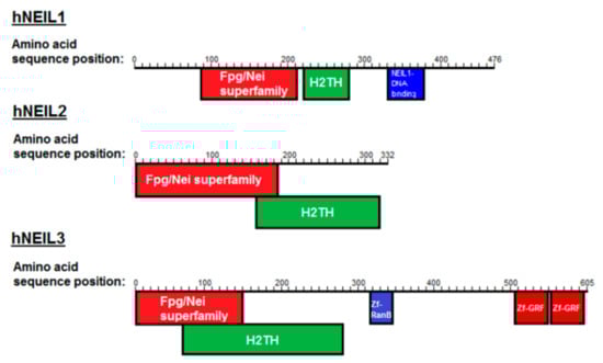 Conserved domains of the Nei-like DNA glycosylases (hNEIL1, hNEIL2 and hNEIL3). Shown are the Fpg/Nei superfamily domains, helix-two-turn helix (H2TH) domains, zinc finger RanB domains (Zf-RanB) domains and zinc finger-GRF domains (Zf-GRF).