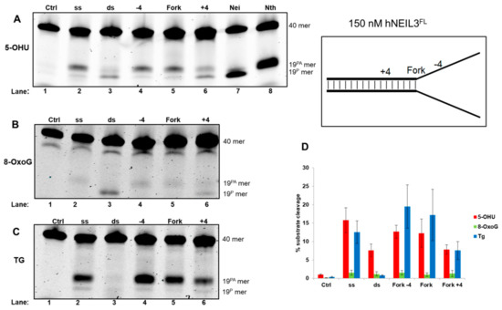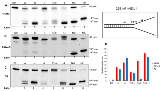 3.4.1. Activity of hNEIL1 on Model DNA Replication Fork Substrates