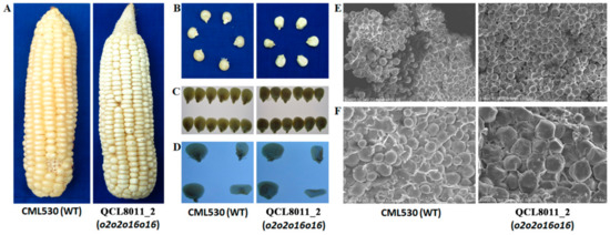 Phenotypic features of CML530 and QCL8011_2. (A) Photographs of intact ears taken under normal light. (B) Photographs of mature kernels taken under normal light. (C) Light transmission of mature kernels on a light box. (D) Cross-sections of mature kernels on a light box. (E) Scanning electron micrograph for endosperms of QCL8011_2 and CML530 at 700× magnification. (F) Scanning electron micrograph for endosperms of QCL8011_2 and CML530 at 1500× magnification.