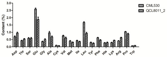 Compared with CML530, the contents of all 17 FAAs changed to different degrees in the QCL8011_2 mutant line. Figure 2 shows that Asp, Thr, Ser, Gly, His, Lys, and Arg contents were higher in QCL8011_2. Among them, Lys, Arg, Gly, Asp, and Trp greatly increased by 56.08%, 55.16%, 38.75%, 36.96%, and 22.17%, respectively. However, Leu, Ala, Glu, Phe, Met, Val, Cys, Ile, Tyr, and Pro contents were decreased. Among them, Leu, Ala, Glu, Phe, and Met greatly decreased by 44.65%, 28.57%, 27.63%, 26.30%, and 22.55%, respectively.