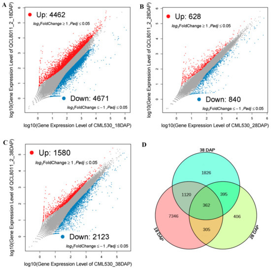 (A) Scatter plots of differentially expressed genes (DEGs) in CML530 vs. QCL8011_2 at 18 day after pollination (DAP). (B) Scatter plots of DEGs in CML530 vs. QCL8011_2 at 28 DAP. (C) Scatter plots of DEGs in CML530 vs. QCL8011_2 at 38 DAP. (D) Venn diagram of DEGs in CML530 vs. QCL8011_2 at 18 DAP, 28 DAP, and 38 DAP.