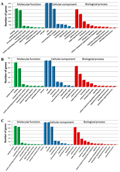 More than 29,000 genes were detected in each sample, which corresponded to more than 70% of the total number of genes (Figure S1 and Table S5). The correlation coefficients among the two sequencing repeats were more than 0.95 (Figure S2), which indicated that the transcriptome sequencing data in all samples were highly reliable and, thus, suitable for analyzing differentially expressed genes.