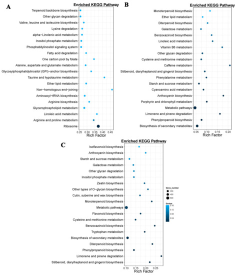 Statistics of pathway enrichment of DEGs in CML530 vs. QCL8011_2 at 18 DAP (A), 28 DAP (B), and 38 DAP (C). X axis means Rich Factor, and Y axis represents second KEGG pathway terms. Rich Factor is the ratio of the differentially expressed gene numbers annotated in this pathway term to all the gene numbers annotated in this pathway term. Greater Rich Factor means greater intensiveness. Q value is corrected p value ranging from 0 to 1, and less Q value means greater intensiveness.