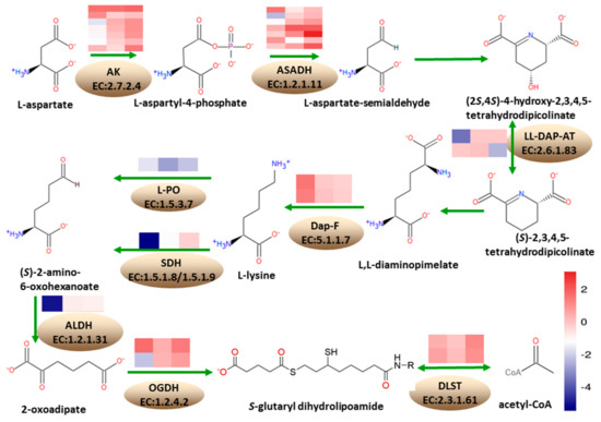 Expression of DEGs and their functions in lysine metabolism. Depths of color in the red and blue rectangles indicate higher and lower Z-score RNA expression lever. The columns on the heat map represent the stage (18 DAP, 28 DAP, and 38 DAP). The rows on the heat map represent the genes. Identified enzymes include: AK—aspartate kinase; ASDH—aspartate-semialdehyde dehydrogenase; LL-DAP-ATL, L-diaminopimelate aminotransferase; Dap-F—diaminopimelate epimerase; L-PO—L-pipecolate oxidase; SDH—saccharopine dehydrogenase; ALDH—aldehyde dehydrogenase; OGDH—2-oxoglutarate dehydrogenase; DLST—dihydrolipoamide succinyltransferase.