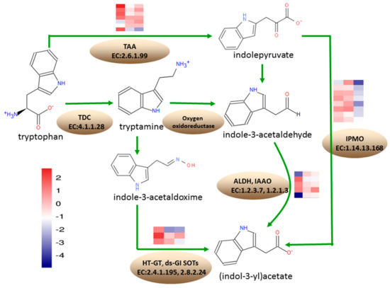 Expression of DEGs and their functions in tryptophan metabolism. Depths of color in the red and blue rectangles indicate higher and lower Z-score RNA expression lever. The columns on the heat map represent the stage (18 DAP, 28 DAP, and 38 DAP). The rows on the heat map represent the genes. Identified enzymes include: TAA—L-tryptophan-pyruvate aminotransferase; IPMO—indole-3-pyruvate monooxygenase; ALDH—aldehyde dehydrogenase; IAAO—indole-3-acetaldehyde oxidase; HT-GT—N-hydroxythioamide S-beta-glucosyltransferase; ds-GI SOTs—aromatic desulfoglucosinolate sulfotransferase.