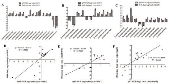 Validation of expression differences identified by RNA-Seq through qRT-PCR of DEGs. (A) Histogram of the 15 DEGs in 18 DAP wild-type and o2o2o16o16 endosperm. (B) Histogram of the 11 DEGs in 28 DAP wild-type and o2o2o16o16 endosperm. (C) Histogram of the 12 DEGs in 38 DAP wild-type and o2o2o16o16 endosperm. (D) Scatter plots of the 15 DEGs in 18 DAP wild-type and o2o2o16o16 endosperm (R2 = 0.7559). (E) Scatter plots of the 11 DEGs in 28 DAP wild-type and o2o2o16o16 endosperm (R2 = 0.7402). (F) Scatter plots of the 12 DEGs in 38 DAP wild-type and o2o2o16o16 endosperm (R2 = 0.6426).