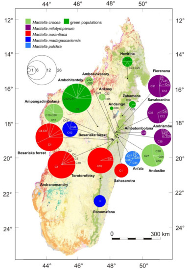 - Crottini, A.; Brown, J.L.; Mercurio, V.; Glaw, F.; Vences, M.; Andreone, F. Phylogeography of the poison frog Mantella viridis (Amphibia: Mantellidae) reveals chromatic and genetic differentiation across ecotones in northern Madagascar. J. Zool. Syst. Evol. Res. 2012, 50, 305–314. [Google Scholar] [CrossRef]
