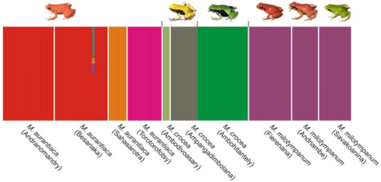 BAPS identified seven clusters as the most probable clustering solution in the data using prior information on the sampling locality of the individuals (PP, posterior probability of each of the analysis replicates > 0.99). The same results were obtained for three independent BAPS runs indicating strong support for the pattern of population structure identified. These included three clusters of M. aurantiaca, i.e., (1) Andranomandry and Besariaka, (2) Sahasarotra, and (3) Torotorofotsy. The M. crocea samples formed three additional clusters: (4) Ambodivoasary, (5) Ambohitantely, and (6) Ampangadimbolana. Lastly, cluster (7) was formed by the M. milotympanun samples from Fierenana-Sahamarolambo, Andriambe and Savakoanina (Figure 6). With the exception of one individual of M. aurantiaca from Besariaka, no other sample presented significant admixture (Figure 6). The genetic variation of this admixed individual resembles to 50% cluster 1, 32% cluster 6, 11% cluster 7, 4% cluster 2, 2% cluster 4, and 1% cluster 3 (Figure 6), however, this observation is likely to be an outlier genotype relative to the allelic frequencies expected under Hardy–Weinberg Equilibrium for these Mantella populations, rather than the outcome of multiple past hybridisations. These observations are supported by the partition results for progressively larger values of K (i.e., from 2 until 7; Figure S2), which show that from an earlier level on (i.e., K = 2) the localities form well defined clusters, and single individuals appear admixed for the different values of K: the same individual from Besariaka found admixed in the K = 7 solution (Figure 6) was also found admixed in K = 5 and K = 6 solutions (Figure S2); however, different individuals were identified as possibly admixed in the K = 4 and K = 3 solutions. An individual-based clustering approach (without prior locality information) in BAPS rendered incongruent results as no stable clustering solution was identified, further reflecting the effect of the little divergence observed between these localities (e.g., Table 2). Consistent with this hypothesis, a correspondence factor analysis using Genetix [78] of either the individuals, or groups of individuals by localities, resulted in a large overlap between samples and localities, respectively (Figures S3 and S4).