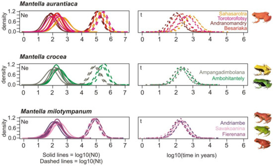 Inferring the demographic history of one species is crucial to better understand how present-day genetic diversity is distributed [84]. A recently published study reveals that both climate change and human colonization triggered habitat loss and fragmentation in Northern Madagascar, two factors that affected the demography of two lemur species [85]. Although it is still widely debated, recent estimates find support for first human activities in Madagascar having started only about 1350 B.P. [43]. Similarly, recent palynological evidence suggests that large scale deforestation in Madagascar occurred later than argued previously, with rises in charcoal abundance older that 2000 y. B.P. being available only from the arid southwest, where natural firing is expected; whereas in wetter regions (such as along the eastern rainforest belt) steep rises in charcoal abundance are mostly found from around 1150–950 y B.P. [86,87]. Similarly interesting, it seems that almost three-quarters of the remaining primary forest of Madagascar was cleared during Colonial Madagascar times (from 1895 to 1925) when population growth was slow and shifting cultivation banned [88], an imposed change in land use that forced many people to find refuge in the forests and oblige them to survive there as shifting cultivators [88]. Finally, Harper et al. [89] reports that Madagacar’s ecosystems have been deeply affected by human-mediated habitat loss and fragmentation in the recent decades, with about the 50% remaining forest cover loss since the 1950s [89,90]. Our demographic analyses identified a severe pattern of demographic contraction affecting the three analyzed swamp forest species (Figure 8) and suggest that this contraction took place in the recent past. Although we cannot exclude that our estimates of effective population size may have been inflated by alleles introduced into the populations by migrants from other populations, it is unlikely that this pattern would have led to a concordant reconstruction of bottlenecks in all populations as found by our analyses. Our probability densities are mostly distributed between 1000 and 100 y ago in almost coincidence with early wide-scale deforestation, and maintained at least until 100 y BP, in accordance with other evidences for increased trends in forest loss and fragmentation in more recent times [88,89], suggesting that forest loss was probably a major trigger for the demographic contraction observed in these species. In addition to this, it is known that these frog species are affected by collecting for the pet trade; about 230,000 specimens of Mantella were exported from Madagascar from 1994 to 2003 [29,30], with M. aurantiaca being the third worldwide-most traded amphibian species [30]. However, the onset of large-scale collection for the pet trade is more recent than the estimated demographic bottlenecks in the three swamp frog species, which instead are in temporal coincidence with the massive events of forest loss in the past centuries [86,87,88,89]. While also today, habitat loss is certainly the most important and imminent threat to Mantella populations (and biodiversity in general), pet trade over-collecting can exacerbate this threat and therefore requires careful regulation. Our data exemplify how the massive past forest reduction has drastically reduced the effective population size of amphibian species, and highlight the importance of fine-scale conservation genetic assessments of the remaining fragmented populations of these species.