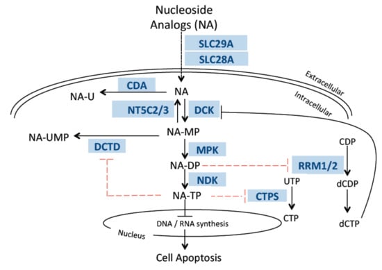 One of the major obstacles in the treatment of AML is development of resistance to nucleoside analogs. There is a growing need to understand the mechanisms that lead to development of resistance to these nucleoside analogs in order to help identify strategies that would effectively treat patients with relapsing or refractory diseases. One of the primary mechanisms of resistance to nucleoside analogs is insufficient intracellular concentration of the active triphosphate metabolite. This insufficient triphosphate levels could be due to inefficient cellular uptake of the drug, reduced levels of the activating enzyme, increased levels of inactivating enzymes and/or due to increased levels of endogenous deoxynucleotide (dNTP) pools [,,,]. Resistance could also develop due to inability to achieve sufficient alterations in the DNA strands or the dNTP pools, either due to altered interaction with DNA polymerases or by a lack of inhibition of ribonucleotide reductases, or due to inadequate p53 exonuclease activity. Since the expression and activity of drug transporters and metabolizing enzymes in the activation pathway of nucleoside analogs plays an important role in development of resistance to the NAs, it is essential to understand the factors influencing the expression and activity of these proteins.