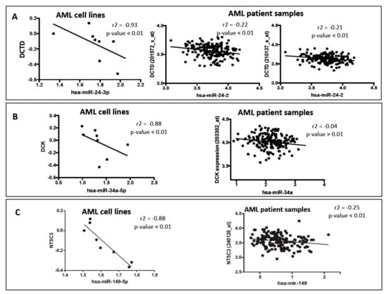Correlation of miRNAs with nucleoside analog pathway gene expression in acute myeloid leukemia (AML) cell lines and patient samples from The Cancer Genome Atlas (TCGA) database. (A) Correlation between DCTD and hsa-miR-24a-3p. (B) Correlation between DCK and hsa-miR-34a-5p. (C) Correlation between NT5C3 and hsa-miR-149.