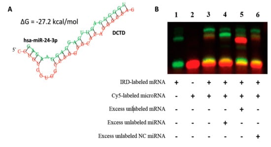 Validation of binding interaction between DCTD mRNA and has-miR-24-3p by RNA electrophoretic mobility shift assays (EMSAs). RNA EMSA with cy5-labeled has-miR-24-3p oligonucleotide and 2’-O-methyl modified and IRD-800 labeled DCTC mRNA oligonucleotide. Lanes 1 and 2 show the mobility of the labeled mRNA or miRNA oligonucleotide. Lane 3 shows the mobility of the labeled has-miR-24-3p oligonucleotide with DCTD mRNA oligonucleotide. Lanes 4 and 6 show the mobility of labeled DCTD mRNA oligonucleotide in presence of unlabeled excess specific competitor (has-miR-24-3p) ad excess unlabeled non-specific competitor (NC).