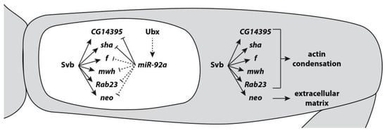 Also in Drosophila, the miR-92 family is involved in the regulation of several developmental processes including circadian rhythm, germline specification, neurogenesis, and trichome patterning, and some of its target genes have been identified [,,,,]. In Drosophila second legs, miR-92a represses trichome formation resulting in a patch of trichome-free cuticle on the proximal region of the femur—the so-called ‘naked valley’ [,]. It was shown that miR-92a targets the mRNA of shavenoid (sha) to block trichome formation [,]. However, over-expression of sha does not produce completely normal trichomes and in addition CG14395, another likely direct target gene of miR-92a, appears to be required []. Intriguingly, several other genes involved in trichome formation that are directly activated by the TF Shavenbaby (Svb) [,] are also predicted to be miR-92a targets (Franke, Arif, Kittelmann and McGregor unpublished data) using TargetScan [] (Figure 2). This suggests that in the GRN for leg trichome patterning, miR-92a targets multiple genes with different roles in the production of trichomes to ensure robust repression of these structures, thus playing an antagonistic role to Svb.