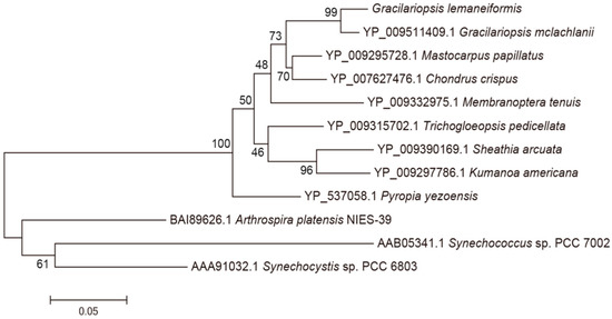 Phylogenetic analysis of PcB amino acid sequences. Numbers at the nodes represent the bootstrap values. The evolutionary distance between the groups is indicated by the scale (0.05 = 5% difference). The sequences of PcB taken from GenBank are as follows: Gracilariopsis mclachlanii (YP009511409.1), Pyropia yezoensis (YP537058.1), Mastocarpus papillatus (YP009295728.1 ), Chondrus crispus (YP007627476.1), Membranoptera tenuis (YP009332975.1), Trichogloeopsis pedicellata (YP009315702.1), Sheathia arcuate (YP009390169.1), Kumanoa Americana (YP009297786.1), Arthrospira platensis NIES-39 (BAI89626.1), Synechococcus sp. PCC7002 (AAB05341.1), Synechocystis sp. PCC 6803 (AAA91032.1).