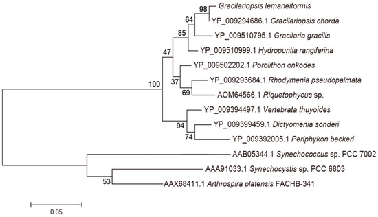 Phylogenetic analysis of PcA amino acid sequences. Numbers at the nodes represent the bootstrap values. The evolutionary distance between the groups is indicated by the scale (0.05 = 5% difference). The sequences of PcA taken from GenBank are as follows: Gracilariopsis chorda (YP009294686.1), Gracilaria gracilis (YP009510795.1), Hydropuntia rangiferina (YP009510999.1), Porolithon onkodes (YP009502202.1), Rhodymenia pseudopalmata (YP009293684.1), Riquetophycus sp. (AOM64566.1), Dictyomenia sonderi (YP009399459.1), Periphykon beckeri (YP009392005.1), Vertebrata thuyoides (YP009394497.1), Synechocystis sp. PCC 6803 (AAA91033.1), Synechococcus sp. PCC 7002 (AAB05344.1), Arthrospira platensis FACHB-341 (AAX68411.1).