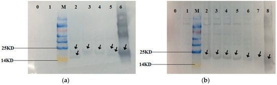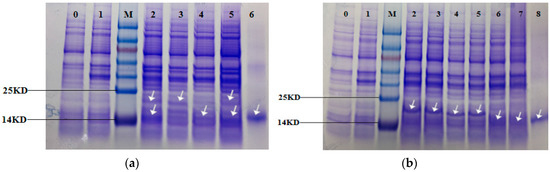 Sodium dodecyl sulfate polyacrylamide gel electrophoresis (SDS-PAGE) of the recombinant strains and mutant strains. Lane 0 is the control strains. Lane 1–6 in (a) are HP, BAHP, BHP, AHP, BAEFHPUST and phycocyanin standard. Lane 1–8 in (b) are HP, BHP, B(82)HP, B(153)HP, B(82,153)HP, AHP, A(84)HP and phycocyanin standard. The recombinant strains BAHP, BHP, AHP, BAEFHPUST in (a) and BHP, B(82)HP, B(153)HP, B(82,153)HP, AHP, A(84)HP in (b) all had significant bands (indicated by the arrow) at about 18 kDa, which were identical to the phycocyanin standard. While the control strain and recombinant strain HP only had a very shallow band at this position. In BAHP and BAEFHPUST, two significant bands were detected. The larger one was the β subunit with more amino acids and the smaller one was the α subunit.