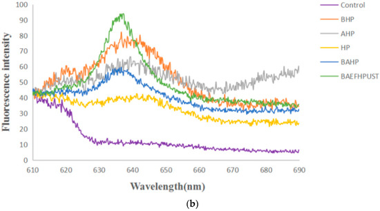 Fluorescence emission spectra of the recombinant strains (HP, BHP, AHP, BAHP, BAEFHPUST) and mutant strains (B(82)HP, B(153)HP, B(82,153)HP, A(84)HP) after excitation at 580 nm. In (a), the fluorescent peak of the mutant strains B (153) HP, B (82) HP and B (82, 153) was lower than that of the unmutated strain BHP, and the fluorescent peak of the mutant strain A (84) HP was lower than that of the unmutated strain AHP. In (b), the strain BAEFHPUST had the highest fluorescence peak.