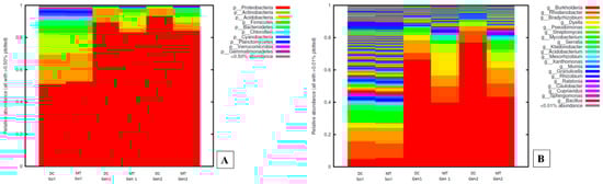 Bacterial diversity plotted as relative abundances shown at the phyla (A) and genus (B) levels, identified from the soils and the DC/MT chambers, respectively.