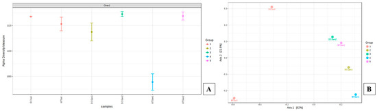 Shown are the α (A) and β diversity (B) analysis and significance testing between the soils and DC/MT chambers. A [PERMANOVA] R-squared: 0.9976; p-value < 0.066667 was obtained from this analysis. Groups shown in the figure refer to the metadata in which soils used in DC and MT experiments were binned, as follows: Group 1 (soils used for DC/MT), group 2 (DC Gen1), group 3 (DC Gen2), group 4 (MT Gen1), and group 5 (MT Gen2), respectively.