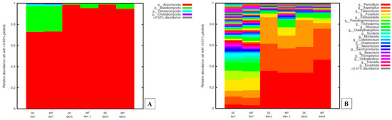Fungal diversity plotted as relative abundances shown at the phyla (A) and genus (B) levels, identified from the soils and DC/MT chambers, respectively.